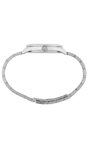 A pulseira em aço prateado oferece resistência e conforto para o uso diário, além de harmonizar perfeitamente com o acabamento monocromático do relógio. O fundo rosqueado reforça a vedação e a proteção do mecanismo interno, aumentando a durabilidade do produto.