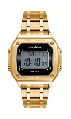 O Relógio Mondaine Digital 32952GPMVDE1 traz o charme do estilo vintage aliado à modernidade da tecnologia digital. Com acabamento dourado, é um acessório versátil, ideal para quem busca personalidade e autenticidade no visual.