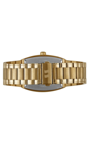 A construção é totalmente em aço inoxidável com acabamento dourado, incluindo caixa robusta no formato retangular e pulseira sólida com fecho buckle one touch, que proporciona praticidade e segurança no uso diário.