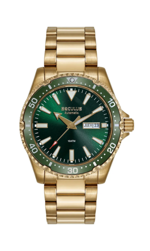 A caixa de 42 mm apresenta acabamento refinado com bisel giratório unidirecional e coroa rosqueada, reforçando a vedação e a segurança. O mostrador verde profundo cria um contraste elegante com o acabamento dourado, entregando presença forte e sofisticada no pulso.