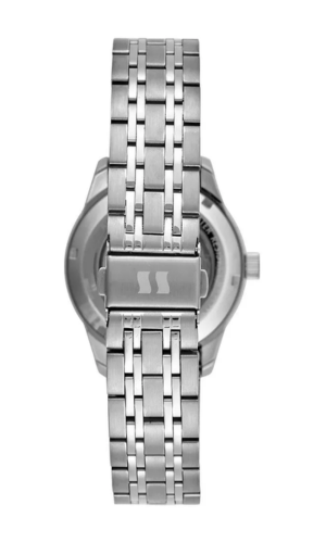 A caixa em aço inoxidável na cor prata, com 41 mm de diâmetro, apresenta proporções equilibradas e construção robusta, garantindo presença elegante no pulso sem exageros. A pulseira sólida em aço, com elos clássicos, complementa o visual técnico e estruturado, oferecendo conforto e segurança para o uso diário.