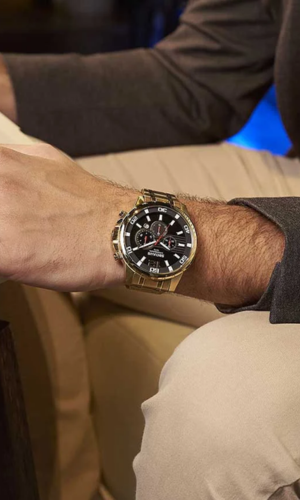 O modelo conta com cronógrafo analógico e calendário com data, agregando funcionalidade ao seu design. Os marcadores com illuminator garantem melhor visualização em ambientes com pouca luz.