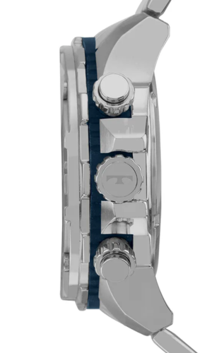 Mostrador azul com duas camadas, efeito de profundidade, aplicação de textura e assinatura da linha. Mecanismo cronógrafo com máquina quartz japonesa Miyota e função calendário.