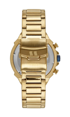 Seu grande diferencial está na catraca com aplicação de arames e parafusos aparentes, um detalhe de forte identidade visual que transmite resistência e personalidade. A folheação dourada contrasta perfeitamente com o mostrador azul, criando um visual moderno, luxuoso e extremamente chamativo.