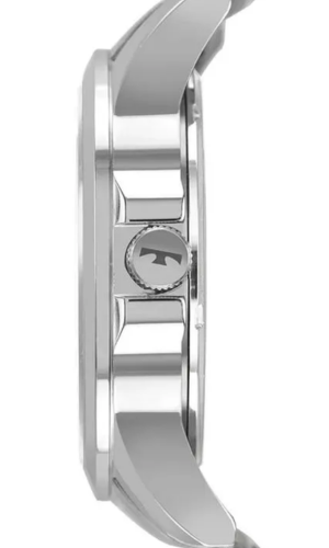 Mecanismo analógico a bateria, com calendário e tampa posterior com fundo rosqueado. Vidro em cristal mineral e pulseira em aço inoxidável com fecho oculto por botão.